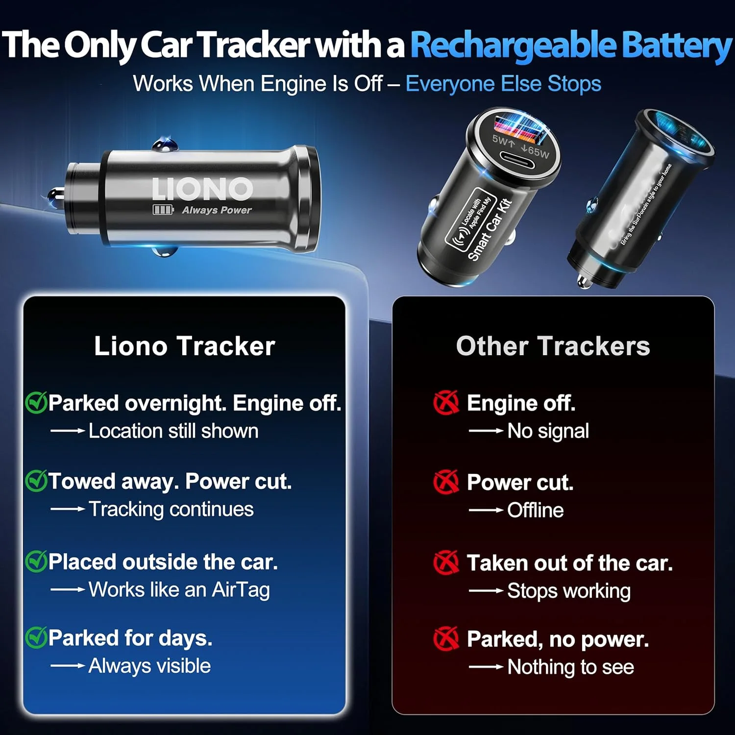 Unlike ordinary plug-in trackers, this device includes a built-in rechargeable battery that keeps tracking your vehicle for up to 3 months even when unplugged or when the engine is off.